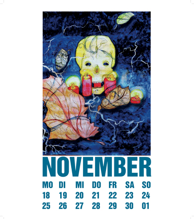 Passend zum Wetter und der Tatsache, dass sich die Sonne jetzt die nächsten vier Monate nicht mehr Blicken lässt, hat Yannik Hilla sei Blatt für den Kalender „Skulls 2013“ gestaltet. Aber das wird schon wieder! Kopf hoch und ich würde mich über seinen „Mai“ Entwurf freuen.