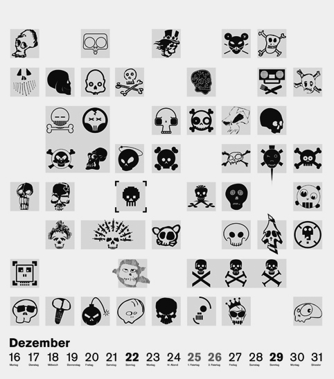 So, das war es mit dem Kalender „Skulls 2013“. Vielen Dank nochmals an alle fürs Mitmachen und ich hoffe Ihr hattet genau so viel Freude dran wie ich! Blatt 26 zeigt nochmals alle Entwürfe aus dem Anfangsjahr 2005 die ja dann als Font veröffentlicht wurden.